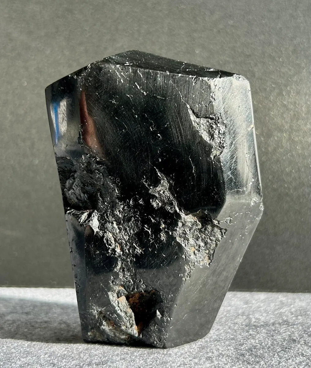 This is an amazing piece. Polished but still lots of raw spots. Top quality Black Tourmaline. Really cool piece, can sit at various angles.