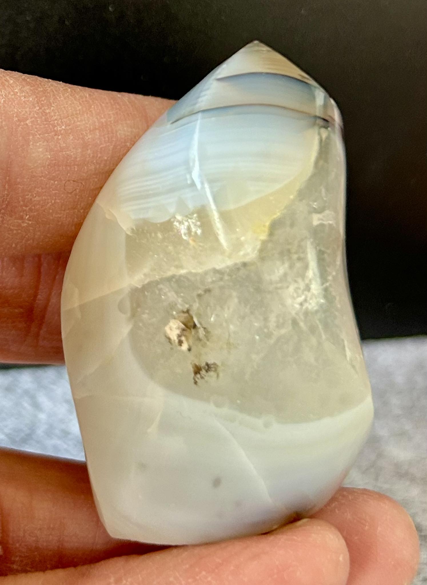 Agate’s natural bands evoke calm strength and grounding. Carved into a flame, it symbolizes transformation through steadiness—helping to center the mind while inspiring quiet motivation.